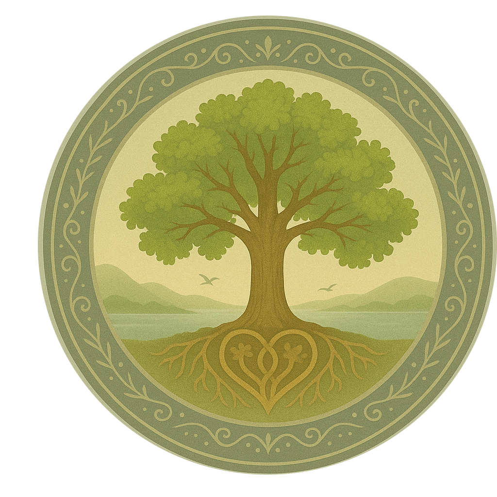 I centrum står et majestætisk egetræ – et symbol på styrke, visdom og liv. Dets rødder danner et hjerte, der repræsenterer kærlighed, fællesskab og den dybe forbundethed, vi deler.